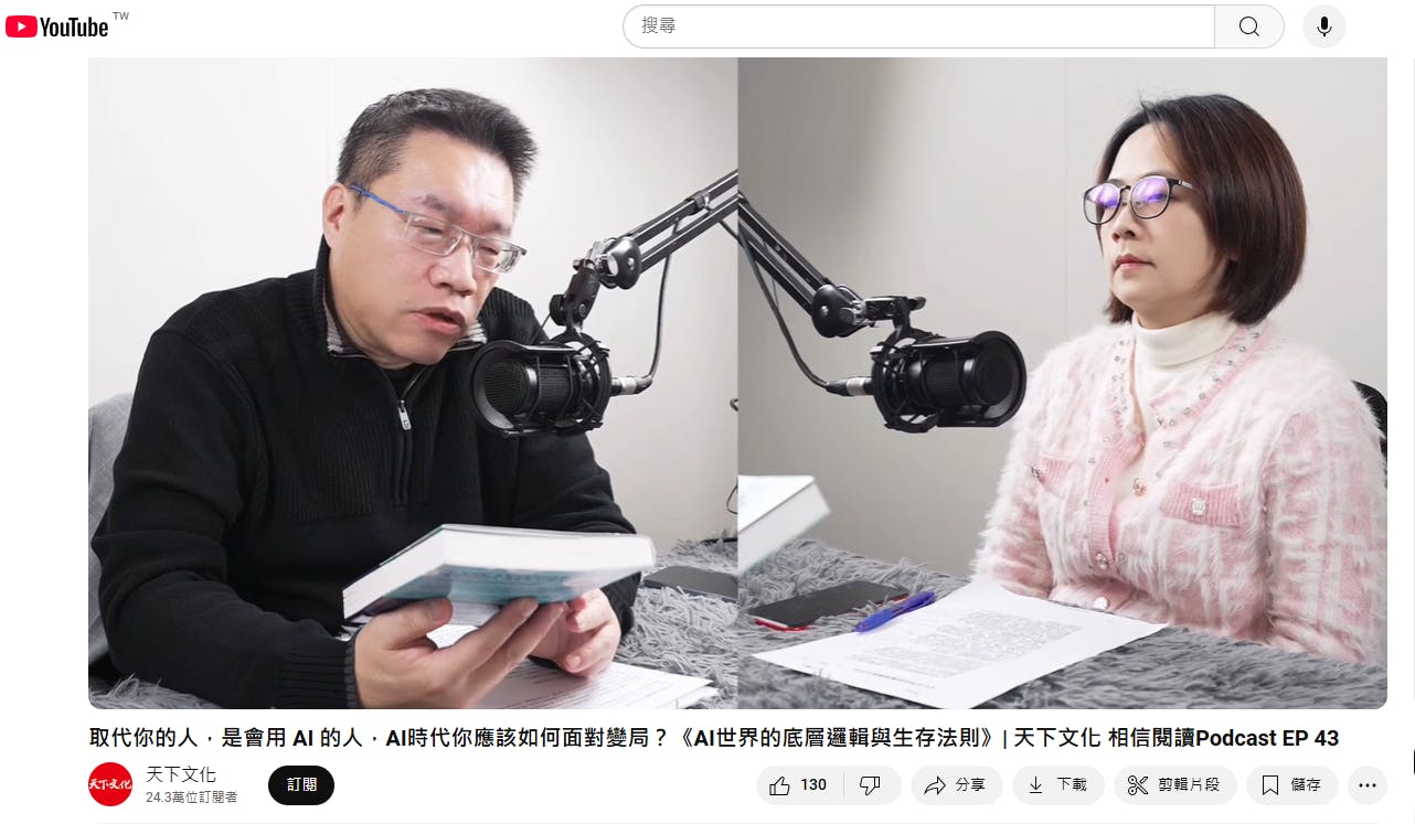 本公司創辦人受邀至天下文化書房憲場與主持人謝文憲(憲哥),共同介紹《AI世界的底層邏輯與生存法則》一書,與聽眾朋友一起分享有關AI應用於工作與日常生活的點滴,淺顯易懂的概念,如同山穎科技的核心價值,以AI數位轉型,創造三贏,陪伴著企業,打造最好的客戶體驗.(線上收看:https://youtu.be/EdOh7npLePA?feature=shared)
